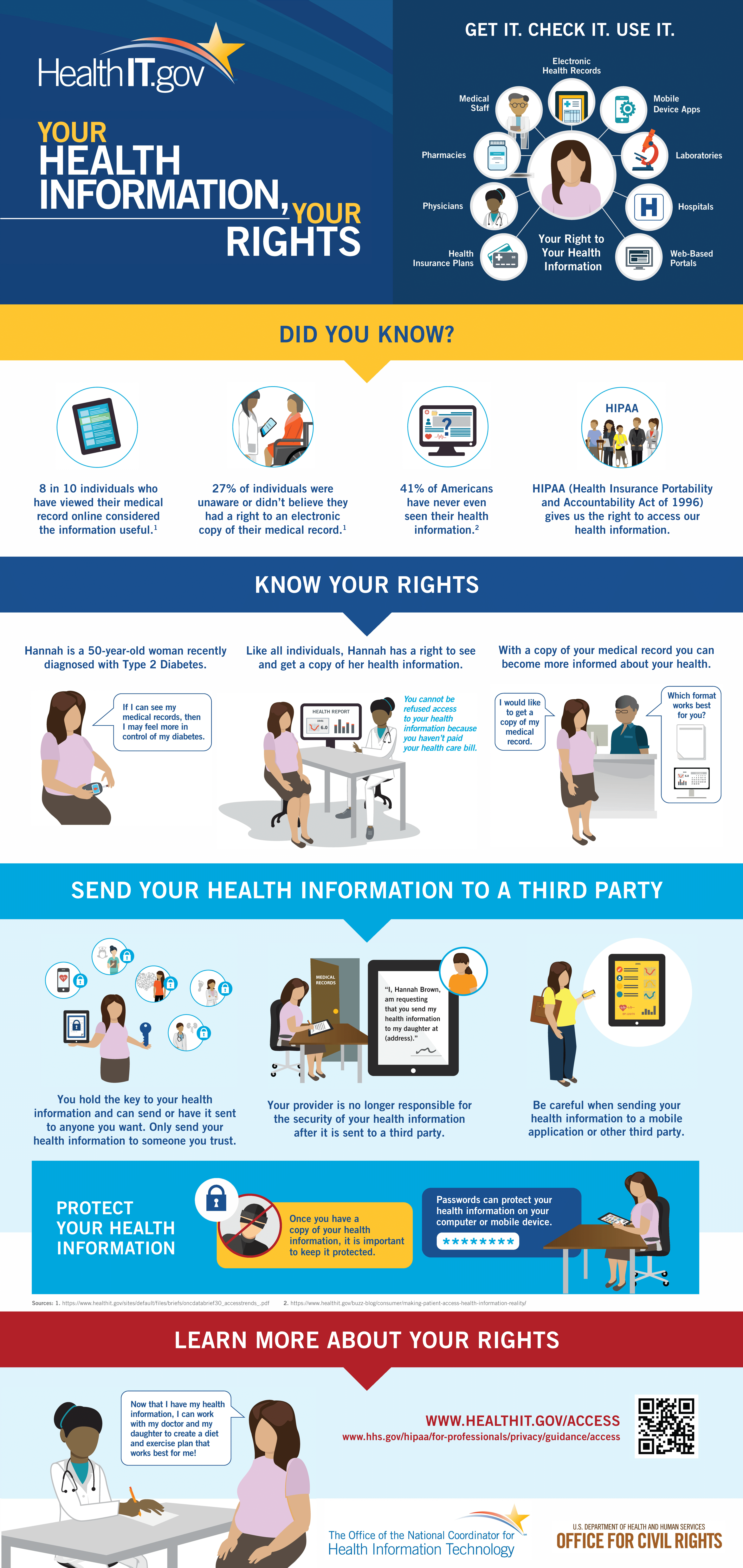 At ONC, we have worked with the HHS Office for Civil Rights, or OCR, to clarify individuals’ legal rights to access their data and transmit it to where they want. We recently adapted this guidance and developed a set of easy-to-understand educational tools in English and Spanish for consumers to understand these important rights, and exercise them. In addition to an easy-to-understand and easy-to-share infographic, we boiled down the legalese into plain language videos—highlighting important components of a patient’s legal right to access their health information.