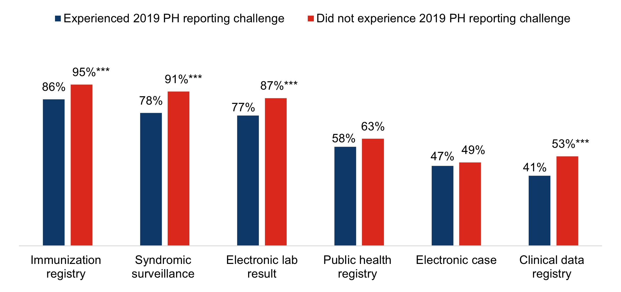 Figure 1: Percent of non-federal acute care hospitals actively engaged in electronic public health reporting in 2021 by whether they experienced a public health reporting challenge in 2019.