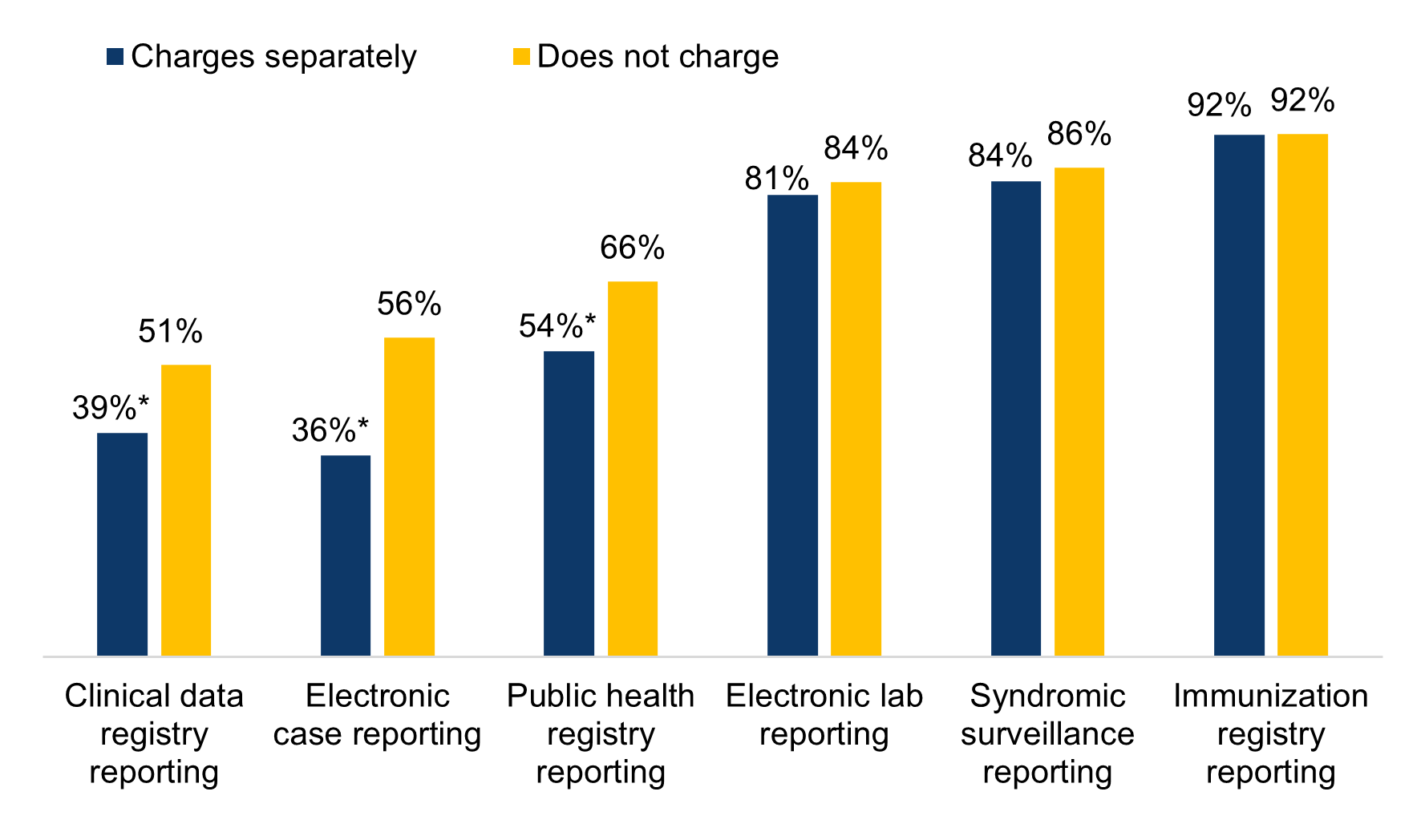 Nationally, lower-resourced hospitals (i.e., small, rural, independent, critical access hospitals) were engaged in fewer types of electronic public health reporting, on average, compared to their higher-resourced counterparts. This may be related, in part, to the price structure used by EHR developers to charge for public health reporting activities or the type of contract a given customer has chosen (e.g., purchase of full enterprise software suites versus select modules). For instance, costs associated with public health reporting services may be bundled or priced separately (i.e., “charged additionally”) from other base services, which may affect hospitals’ decisions to add on these services – particularly for optional reporting types. Compared to nearly a quarter of hospitals nationally, we found that lower-resourced hospitals were more likely to indicate their EHR developer charged separately for public health reporting—which was associated with significantly lower rates of clinical data registry reporting, electronic case reporting, and public health registry reporting compared to hospitals whose EHR developer did not charge separately. These findings suggest that additional costs incurred to submit data for public health reporting activities may hinder engagement in certain types of electronic public health reporting – particularly those that are not mandatory (e.g., public health and clinical data registry reporting). Further work is needed to understand how state policies and different pricing structures contribute to the variation in fees charged for public health reporting.