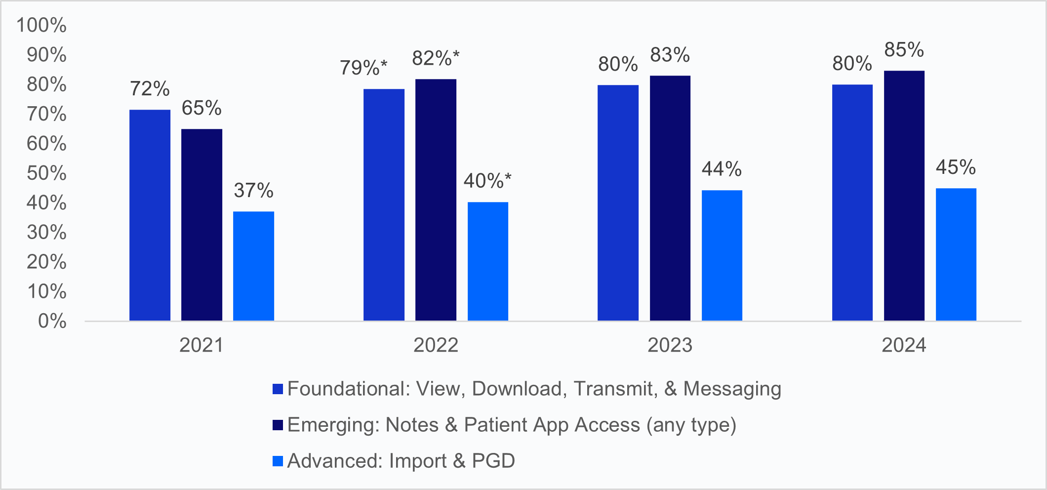 Hospitals’ overall adoption of patient engagement capabilities has increased over time. This signals broader availability of digital tools that enable patients to manage their health information across foundational, emerging, and advanced capabilities. Adoption of these functionalities had significant growth between 2021 and 2022, followed by slower but continued growth through 2024. During this period, the percentage of hospitals with all four foundational capabilities (view, download, transmit, and message) increased 11% (from 72% to 80%), emerging capabilities (notes and any type of app access) increased 31% (from 65% to 85%), and both advanced capabilities (import, PGD) increased 22% (from 37% to 45%). The upward trend in advanced capabilities highlights hospitals’ growing readiness to support patient access and engagement, even in the absence of specific policies or other federal nudges.