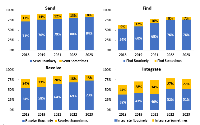 The interoperability metric used by ONC is used to understand the current state of health IT adoption and to identify areas in which improvements can be made. This metric comprises the ability to send, find, receive, and integrate information electronically from outside sources. Those hospitals with responses of rarely, no, do not know, or not applicable were coded as no. In 2023, 8% of hospitals did not send, 18% of hospitals did not find, 14% of hospitals did not receive, and 22% of hospitals did not integrate electronic health information.